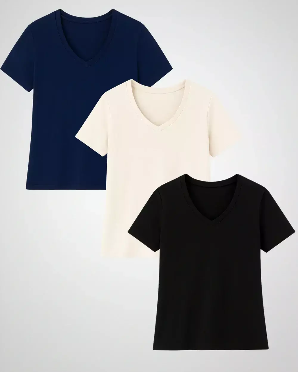 Kit de Três camisetas clássicas e atemporais, confeccionadas em malha premium macia e respirável, que garantem máximo conforto, caimento perfeito e alta durabilidade. Nas cores preto, azul marinho e bege, esse kit é a escolha ideal para compor looks versáteis, elegantes e prontos para qualquer ocasião.